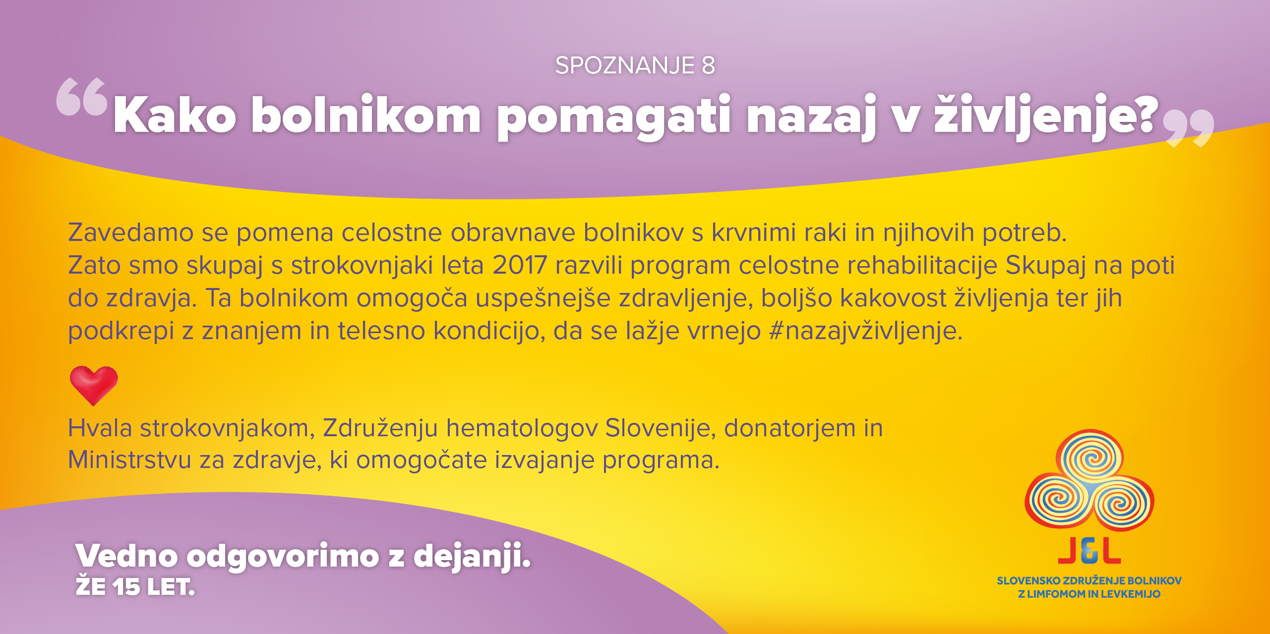 Kar težko verjamem, da je minilo že 15 let od ustanovitve Združenja in dobrih 15 let od moje diagnoze. Takrat, pred dobrimi 15. leti, me je bolezen ustavila v 4. letniku gimnazije tik pred maturo, finalom ŠKL (Šolske košarkarske lige), maturantskim plesom in najbolj brezskrbnimi poletnimi počitnicami pred začetkom študija. Tako kot za večino bolnikov, je bila tudi zame diagnoza raka – natančneje primarnega mediastinalnega velikoceličnega limfoma B – velik šok. Kar naenkrat se je moje življenje vrtelo samo okrog bolezni, ciklusov kemoterapij in obsevanja. Tudi drugi, ki so se srečali s tovrstnimi diagnozami in intenzivnim zdravljenjem, navadno poročajo o podobnih izkušnjah. Da se običajno življenje nekako ustavi, temelji se zamajejo in posameznik se sooči s pomembnimi eksistencialnimi vprašanji. Zdravstveni sistem načeloma zelo dobro poskrbi za posameznika z vidika diagnostike, zdravljenja in vseh strogo medicinskih vidikov. Pri celostni obravnavi posameznika, ki se sooča s težko boleznijo in zdravljenjem, pa je še veliko možnosti za izboljšave. Ko se posameznik sreča s težko boleznijo hitro spozna, da ima le-ta vpliv na zelo različne vidike življenja. Psihološki, socialni, pravni in drugi vidiki so znotraj javnega zdravstva pogosto zelo zanemarjeni, tudi kadar povzročajo hude stiske.