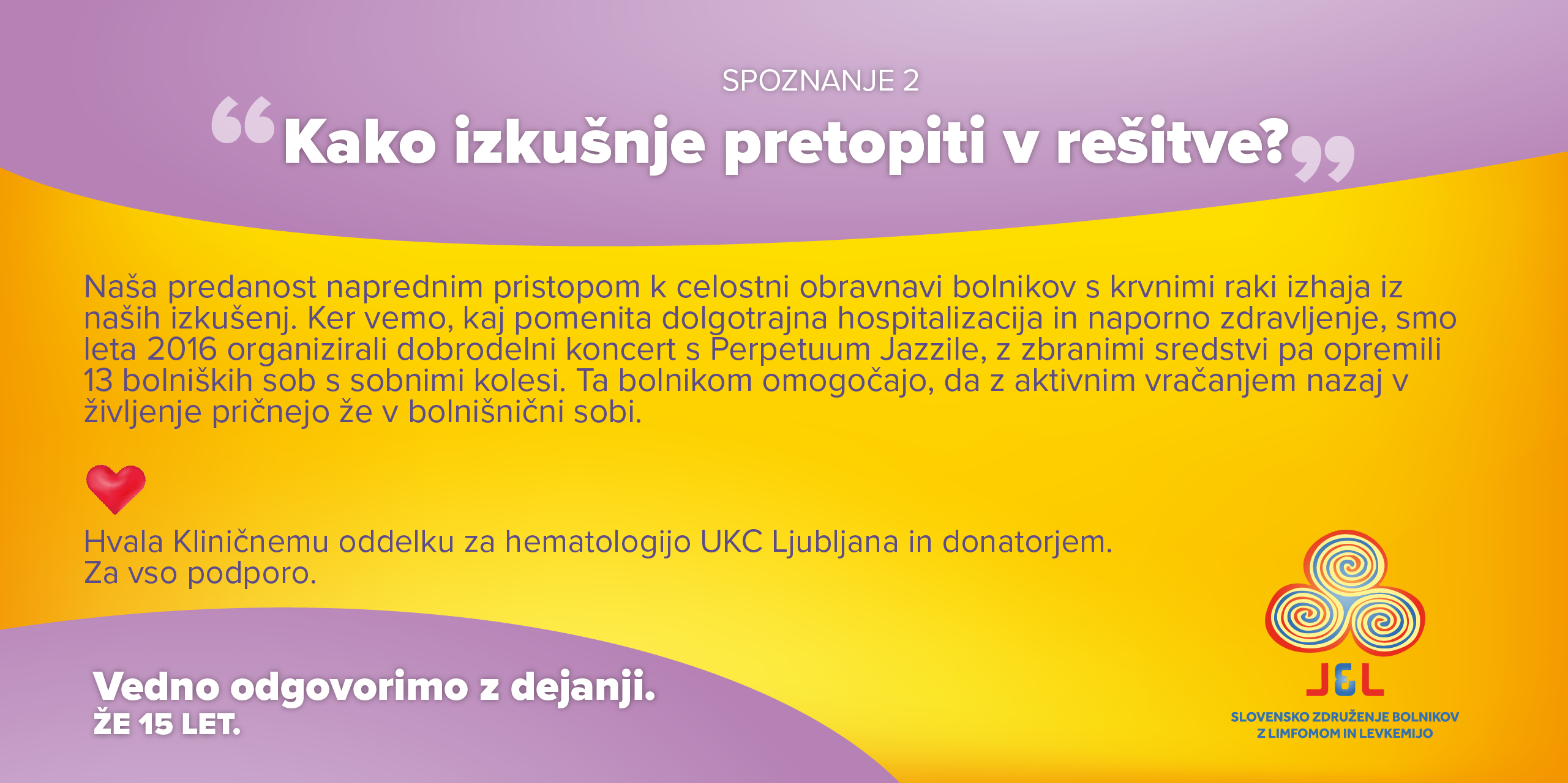 Letos, ko obeležujemo 15 let delovanja, smo se ozrli nazaj, naredili inventuro prehojene poti in vseh uspehov. Res smo dobri, prodorni in neumorni. Vse nas pri tem vodi lastna izkušnja bolezni ali bolezen bližnjega, prijatelja. To je tista pomembna osnova, da znamo prepoznati potrebe in ob pomoči lastnih izkušenj sodelovati pri iskanju rešitev. Rešitev v dobro bolnikov, strokovnjakov in nenazadnje hematološke in onkološke stroke.