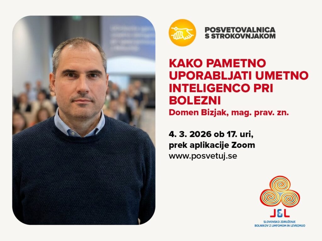 Vabimo vas na spletno predavanje Domna Bizjaka, magistra pravnih znanosti, ki bo na naslednji posvetovalnici predstavil praktične in varne načine uporabe orodij generativne umetne inteligence, kot je ChatGPT. Predavanje z naslovom “Kako pametno uporabljati umetno inteligenco pri bolezni” bo potekalo v sredo, 4. marca 2026, ob 17. uri, prek aplikacije Zoom.