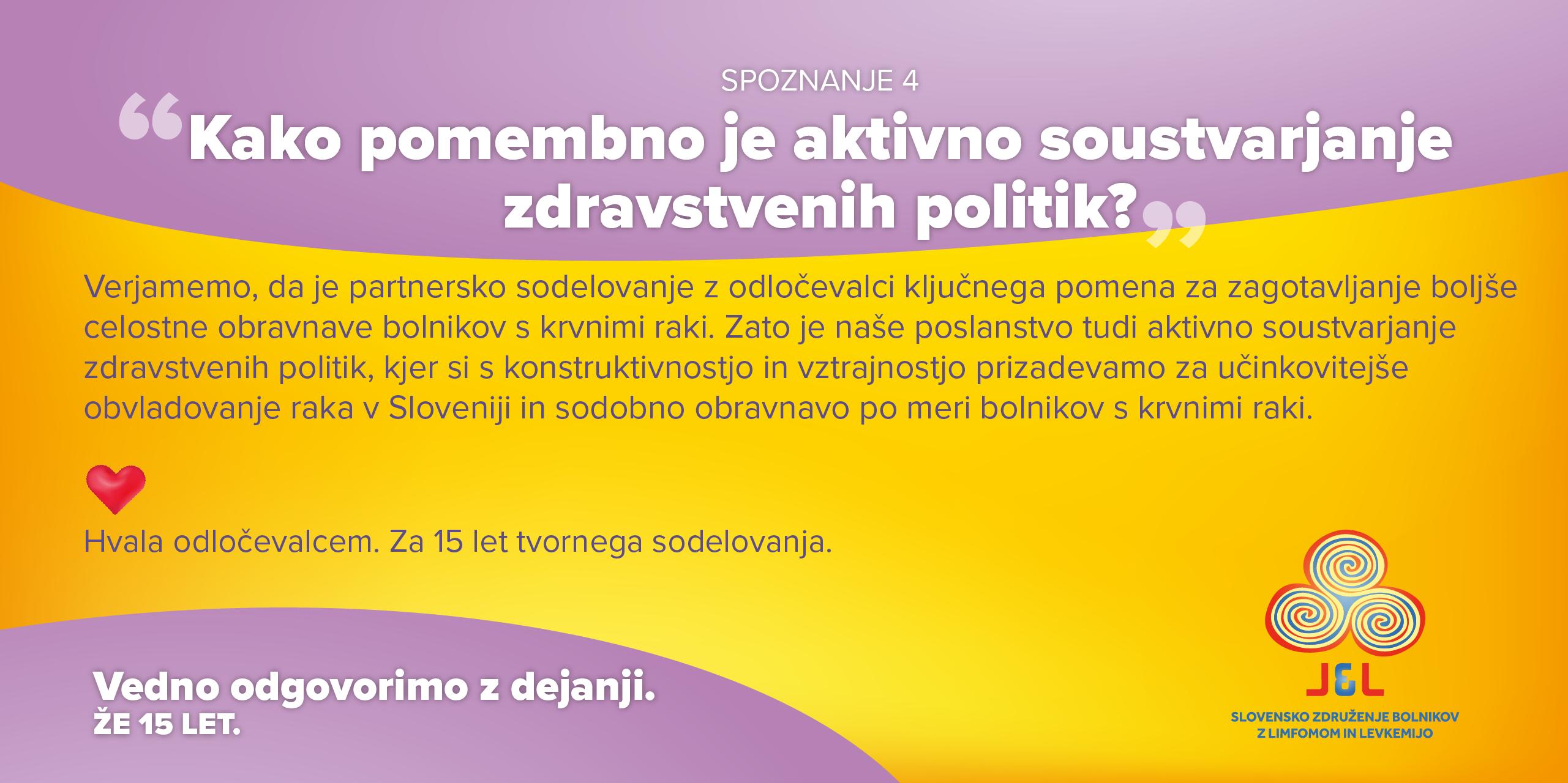 Za vse te in številne druge izzive zdravljenja hematološko – onkoloških bolezni je profesionalno združenje bolnikov izjemnega pomena. Kajti ne le, da bolnike, svojce in druge zainteresirane javnosti ozavešča, informira in s številnimi podpornimi programi krepi, temveč v slovenskem prostoru gradi in neguje tudi odnose s strokovnjaki, odločevalci in drugimi partnerji v oblikovanju in implementaciji  zdravstvenih in ostalih politik, ki na kakršenkoli način zadevajo kakovost življenja bolnikov s krvnimi raki.