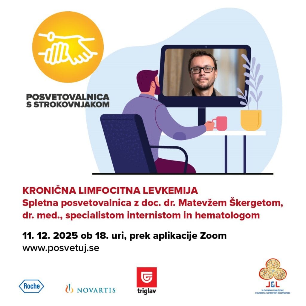Vabljeni na spletno predavanje doc. dr. Matevža Škergeta, dr. med., specialista internista in hematologa, ki deluje na Kliničnem oddelku za hematologijo UKC Ljubljana. Predavanje z naslovom “Kronična limfocitna levkemija” bo potekalo v četrtek, 11. december 2025, ob 18. uri, prek aplikacije Zoom.