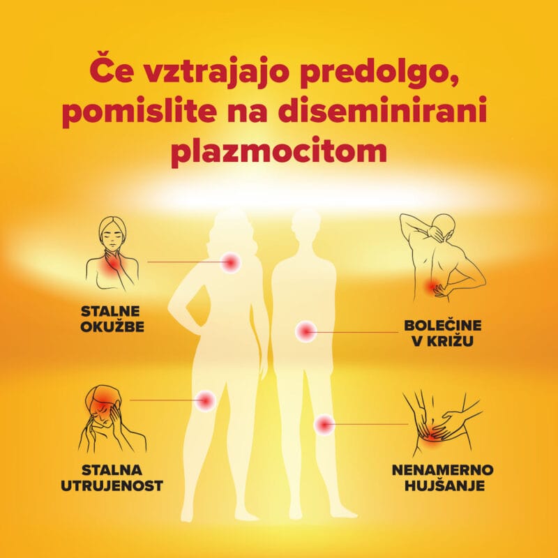 Diseminirani plazmocitom se pogosto začne tiho. Kot utrujenost, bolečine v križu, ki jih pripišemo letom, stresu ali naporu. Zato ga prepogosto spregledamo, simptome beremo napačno.