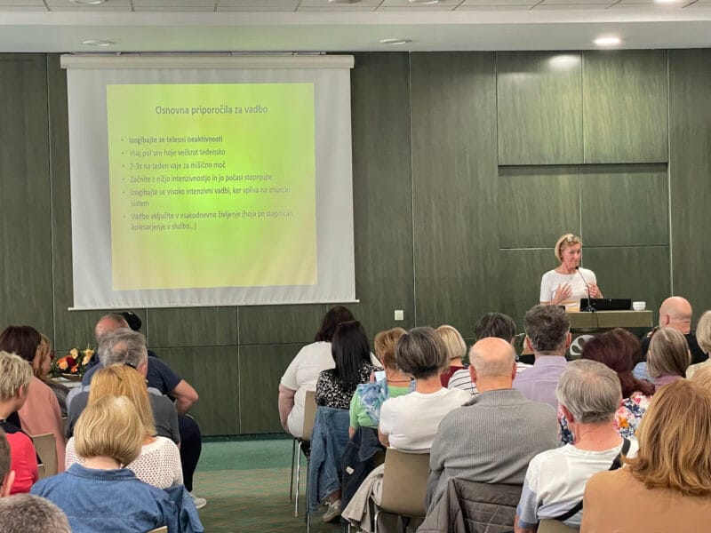 Maja Ogrinec, diplomirana fizioterapevtka s KOH UKC LJ, ki vodi fizikalni modul v programu rehabilitacije, je predstavila pomen telesne aktivnosti v času zdravljenja in podala priporočila za vadbo doma. Poudarila je, kako pomembno je, da zberemo moč tudi, ko je najtežje, saj to ohranja našo mišično moč, ki pomembno prispeva k uspehu zdravljenja in dobremu počutju.