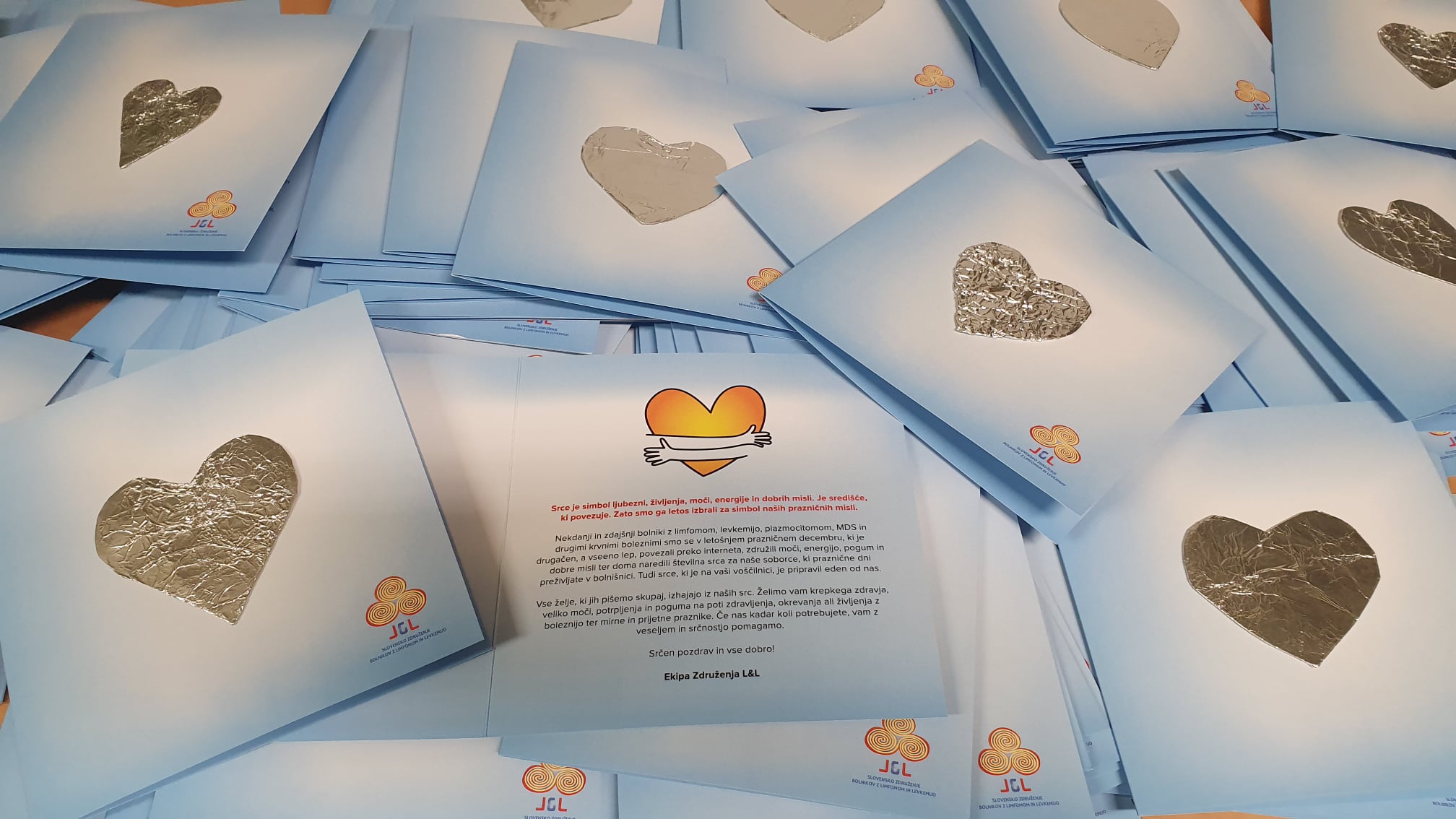 Nalepljena unikatna srca na voščilnice skupaj z dobrimi željami vseh, ki smo sodelovali, bodo te praznične dni razveseljevala tako bolnike kot zdravnike, medicinske sestre, strežnice, zaposlene v laboratoriju in administraciji na KOH UKC LJ, na odd. D1 OI, na hematološkem odd. UKC MB in SB Celje ter SB Nova Gorica.