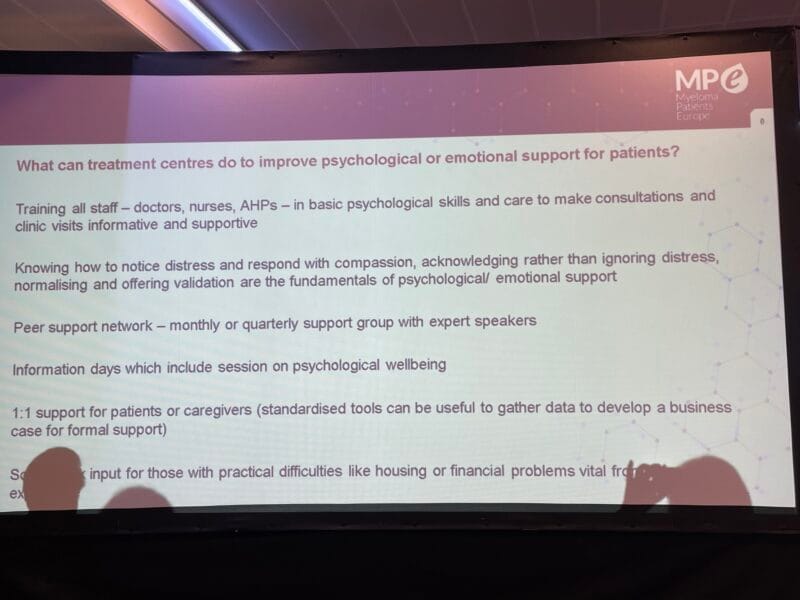 Surabhi Chaturvedi, klinična psihologinja hematološko-onkološkega oddelka ter oddelka za transplantacije in CAR-T na King’s College Hospital v Londonu, je predstavila pomen psihološke podore bolnikom in njihovim svojcem ter prikazala klinično pot obravnave bolnikov v njihovi kliniki. Izpostavila je veliko potrebo bolnikov in svojcev po psihološki pomoči ter pomembno vlogo organizacij bolnikov pri podpori bolnikom in zagovorništvu za boljši dostop do tovrstne obravnave.