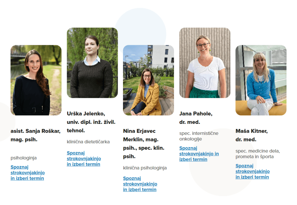Ekipo strokovnjakov za posvetovalnice trenutno sestavljajo psihologinja, klinična psihologinja, klinična dietetičarka, specialistka internistične onkologije in specializantka medicine dela, prometa in športa, ki so s svojim strokovnim znanjem in bogatimi kliničnimi izkušnjami pravi naslov za vaša vprašanja.